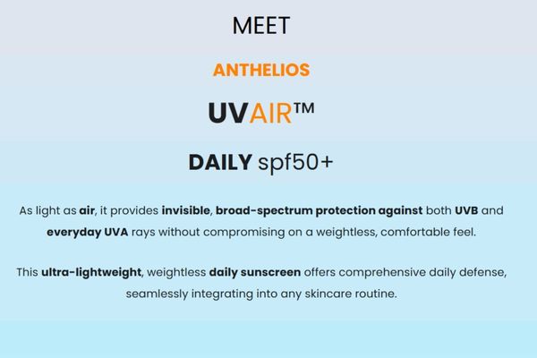Anthelios UVAIR™ isn’t your typical sunscreen. Thanks to UVAIR™ technology, it delivers high-performance, broad-spectrum SPF50+ protection against both UVB (think sunburn) and those sneaky UVA rays that contribute to premature aging — all while feeling weightless on your skin.