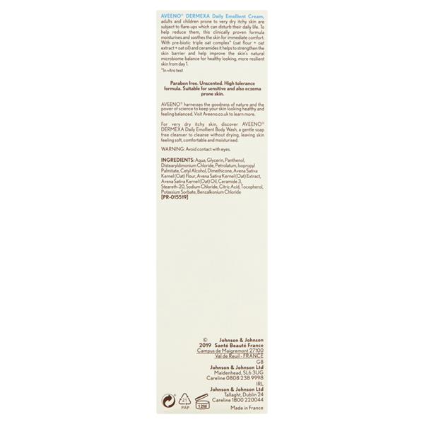 Aveeno Dermexa Daily Emollient Cream, adults and children prone to very dry itchy skin are subject to flare-ups which can disturb their daily life. To help reduce them, this clinically proven formula moisturises and soothes the skin for immediate comfort. With pre-biotic* Triple Oat Complex (Oat Flour, Oat Extract, Oat Oil) and Ceramides it helps to strengthen the skin barrier and improve the skin's natural microbiome balance for healthy-looking, more resilient skin from day one.