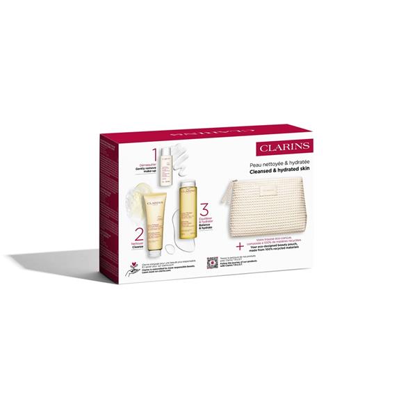 A 3 step routine for normal to dry skin in need of gentleness and freshness: a cleansing milk to remove make up, a hydrating foaming cleanse to cleanse skin and a toning lotion to balance and hydrate.