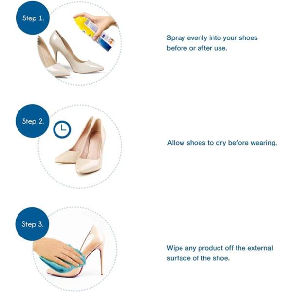 Shake well before use. Spray evenly inside your shoes before or after wearing them. Wipe away any excess spray from the outside and allow shoes to dry for a few moments before putting them on.