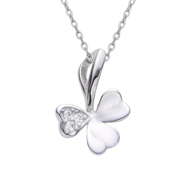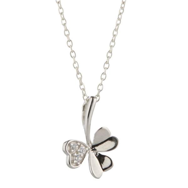It is sterling silver with a petal of cubic zirconia. It measures approx 10mm in width and approx 15mm in length. It is supplied with an 18? sterling silver chain.